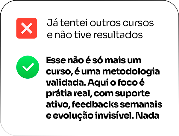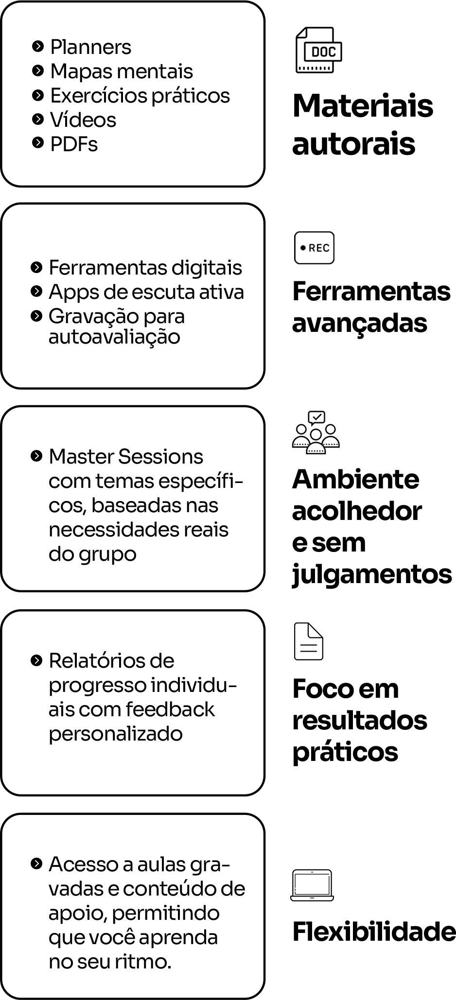 Utilizamos prática real, feedbacks constantes e um acompanhamento próximo, para garantir que você evolua de maneira eficaz e constante.